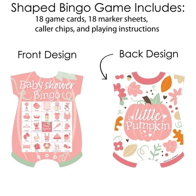 Pink Pumpkin Themed Bingo Cards and Markers INCLUDES 18 game cards, 18 perforated marker sheets, 1 perforated call sheet, and game instructions. MUST-HAVE PARTY SUPPLY: Bingo is an easy and classic Girl Little Pumpkin game that everyone will have fun playing. Autumn Pumpkin Themed Bingo Cards and Markers give this classic game a fresh look with Pumpkin-Shaped playing cards and Baby-related words instead of numbers. HOW TO PLAY: Begin play by the designated bingo leader pulling a caller chip from the bowl. Each guest covers the called word on their card with square marker. Continue until a guest has covered a row in any direction – vertically, horizontally, or diagonally and calls out βBINGO!β. HIGH-QUALITY: Girl Little Pumpkin Shaped Bingo Cards & Markers are professionally printed and double-sided on sturdy cardstock paper. They are individually inspected and carefully packaged by hand. Each Baby Body Suit-Shaped card measures 5.25β Wide x 6.75β Tall, perforated marker sheets measure 2.75β Wide x 5β Tall and individual markers measure 0.75β Wide x 0.75β Tall. MADE IN THE USA: Girl Little Pumpkin – Shaped Bingo Game is designed and manufactured at our Wisconsin facility using materials that are Made in the USA.