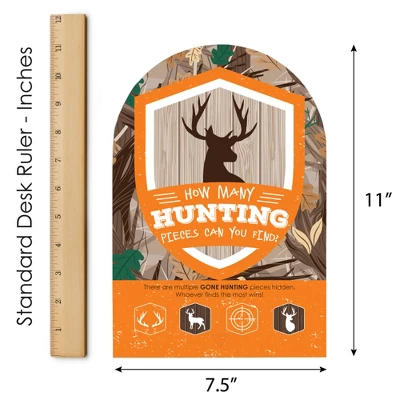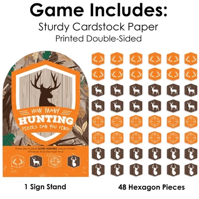 Gone Hunting Hide and Find Game INCLUDES 1 sign with a built-in stand and 48 hexagon game pieces that you can hide for an exhilarating scavenger hunt at your Birthday Party or Baby Shower. Easy Assembly: Gone Hunting game sign comes with built-in stand and requires some easy DIY assembly. To display your sign, fold the sides of the stand towards the center. Then, fold down the support piece of the stand until it rests in the notches. How To Play: Hide and find game sign shows the design of each hexagon piece, so display on a table where everyone can see. Then, find creative places to hide the game pieces around your venue. Finally, send your guests to hunt for the pieces. Whoever finds the most pieces wins! For a twist, divide the guests into teams and assign each team a piece to hunt for. High-Quality Supply: Deer Hunting Camo Themed Hide and Find Game is professionally printed double-sided on heavy-duty cardstock paper with a photo-like shine. Sign measures 7.5” wide by 11” tall and hexagon pieces measure 2.25” wide by 2.25” tall. Made In The USA: Gone Hunting Hide and Find Game is designed and manufactured at our Wisconsin facility using materials that are Made in the USA.