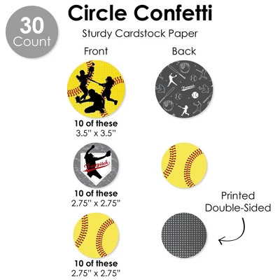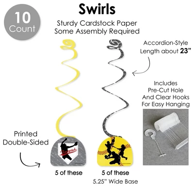 SWIRLS includes: 10 total swirls with 2 designs – 5 count per design, that hang with an accordion-style spiral. Professionally printed double-sided, the Grand Slam – Fastpitch Softball decoration swirls come with a 5.25” wide base and a spiral length of about 23” long. Each decoration swirl comes with a pre-cut hole and clear hooks for easy assembly. BUNTING BANNER includes: letter and themed pennants, perfect for your Sports Themed Baby Shower or Birthday Party. Each pennant measures 5” wide x 7.25” tall. Pennants are numbered in sequence and ribbon is included for easy assembly. TABLE TOPPERS includes: 10 centerpiece sticks that come with two shape cut-out designs, each professionally printed double-sided. The centerpiece shapes measure 7.5” wide x 5” tall. To use as centerpieces or photo props for your Baby Shower or Birthday Party, assembly stickers are included for the easy DIY required assembly. CIRCLE CONFETTI includes: 30 paper circles with 2 different sizes – 10 large circles, size 3.5” and 20 small circles, size 2.75”. Professionally printed double-sided, the Grand Slam – Fastpitch Softball circle confetti can be placed flipped over for added variety. Scatter around your table for a delightful accent. MADE IN THE USA: Grand Slam – Fastpitch Softball Decor Galore Party Pack is designed and manufactured at our Wisconsin facility using materials that are Made in the USA.