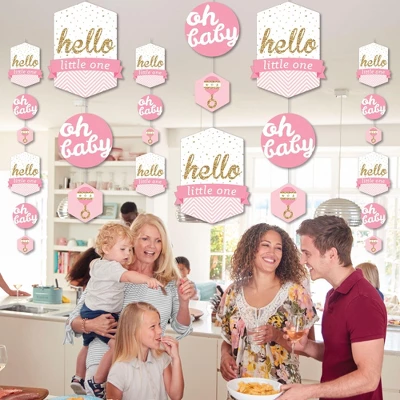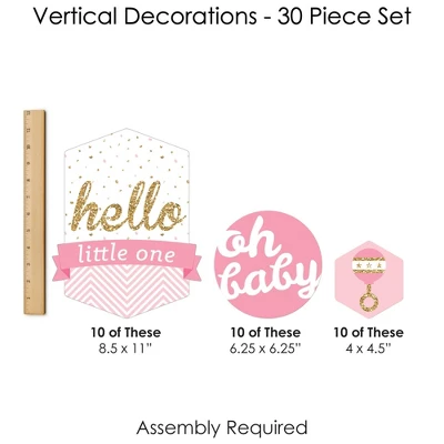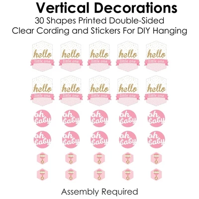 Hello Little One – Pink and Gold Hanging Vertical Decorations INCLUDE 30 shaped pieces, 1 roll clear cording, and assembly stickers. Hello Little One – Pink and Gold Vertical Decorations are fun and versatile party danglers for your next Baby Shower. ROOMERIFIC: Hello Little One – Pink and Gold Hanging Vertical Decorations can be displayed at any lengths you choose and make an attractive backdrop for your next Baby Shower. Shaped pieces come in 3 sizes of 10 each, with the following specifications: 10 at 8.5 x 11 inches, 10 at 6.25 x 6.25 inches, and 10 at 4 x 4.5 inches. Hang near a wall to capture fun group photos, or place throughout the room to create a unified theme. They look amazing when coordinated above gift and buffet tables. DIY DONE RIGHT: Get ready for guests in a snap with this colorful, easy-to-assemble, 30-piece Hello Little One – Pink and Gold Hanging Party Decorations kit. Printed double-sided, each shaped piece includes top and bottom tabs for easy hanging. Simply interlock clear cording into each piece and secure with provided clear stickers. HIGH-QUALITY DECOR: Hello Little One – Pink and Gold Hanging Vertical Decorations are professionally printed on heavy-duty cardstock paper. Each piece is individually inspected and carefully packaged by hand. Requires some simple do-it-yourself assembly. Use provided clear cording to display decorations however you prefer. MADE IN THE USA: Hello Little One – Pink and Gold Hanging Vertical Decorations are designed and manufactured at our Wisconsin facility using materials that are Made in the USA. Hello Little One – Pink and Gold Hanging Vertical Decorations use a No-Mess Glitter Print: Our Vertical Decorations are designed with a printed image of glitter, eliminating glitter flake while maximizing bling effect!