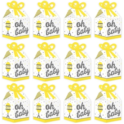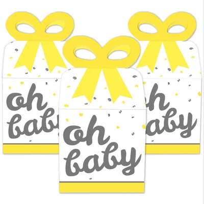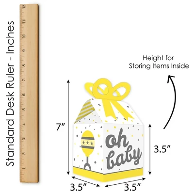 Bow Boxes INCLUDE: 12 Gender Neutral Baby-themed square favor gift boxes. Each box SIZE measures 3.5 inches length x 3.5 inches width x 7 inches height. Bow boxes are ideal for small gifts and treats that are under 3.5 inches tall (height for storing items in closed box). When assembled and closed, each box creates a 3D paper bow-shaped top with a square bottom. CUTE GIFT BOXES: This small, closed favor box can be filled with homemade treats (fun cupcake box), party trinkets, or thank you gifts. At the party, have each guest fill their Yellow, White and Grey “Oh Baby” bow box with snacks from a candy buffet or use as a party loot box. Guests will have fun guessing what surprise each favor gift box contains. PREMIUM PARTY SUPPLY: Bow boxes are professionally printed and double-sided on heavy-duty cardstock paper, with a photo-like shine. They are hand-folded, individually inspected, and then carefully packaged. EASY ASSEMBLY: Gender Neutral Baby bow boxes will arrive flat. Each bow box has crease lines and numbered tabs for easy folding. Finish the DIY assembly by interlocking top of box to create a three-dimensional bow. Packaging will include assembly instructions. MADE IN THE USA: Yellow, White and Grey “Oh Baby” Baby Shower bow boxes are designed and manufactured at our Wisconsin facility using materials that are Made in the USA.