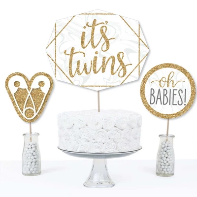 It’s Twins – Gold Centerpiece Sticks INCLUDES 15 It’s Twins – Gold table toppers in three different shapes, 15 sticks and stickers for easy assembly. Oh babies party table decorations are perfect for a baby shower. It’s Twins – Gold Party Centerpiece Sticks SIZE five It’s Twins – Gold table toppers, 10.75″ wide x 8.5″ tall; five pins table toppers, 5″ wide x 5.25″ tall; and five circles table toppers, 5.75″ wide x 5.75″ tall. The unique design and variety of pieces makes this table decoration kit an impressive addition to any twins theme party. EASY PARTY DECOR: It’s Twins – Gold table decorations can be used as centerpieces when attached to the included sticks and inserted into vases or floral arrangements. They easily accent your baby shower candy buffet when you add them to apothecary jars. Table toppers are also a great addition to any photo booth. The large shaped cut outs will make your party pics instantly shareable. It’s Twins – Gold centerpiece sticks are sure to make a statement however you choose to use them! PREMIUM PARTY SUPPLIES: It’s Twins – Gold party table toppers are professionally printed on heavy-duty cardstock paper with a photo-like shine. They are individually inspected and carefully packaged by hand with sticks and stickers for easy assembly. Get creative with your DIY party ideas! MADE IN THE USA: It’s Twins – Gold – Baby Shower Centerpiece Sticks are designed and manufactured at our Wisconsin facility using materials that are Made in America. Twins decoration kit uses a No-Mess Glitter Print: Our decor kit is designed with a printed image of glitter, eliminating glitter flake while maximizing bling effect!