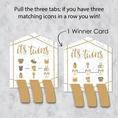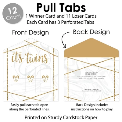 It’s Twins – Gold Pull Tabs 3-in-a-Row INCLUDES 12 pull tab game cards with 1 winning card and 11 losing cards. Great for a Twin Baby Shower, these game cards are for entertainment purposes only. FUN FOR ALL: The It’s Twins – Gold 3-in-a-Row pickle cards can be played by children and adults. It’s the perfect way to add excitement to your event! Prize is determined by the event host. HOW TO PLAY: Hand out one Pull Tab Game Card to each player. Players will then pull each tab open along the perforated lines. If there are three matching icons in a row, the player wins! HIGH-QUALITY: It’s Twins – Gold Pull Tabs 3-in-a-Row Cards are professionally printed double-sided on sturdy cardstock paper with a photo-like shine. They are individually inspected and carefully packaged by hand. MADE IN THE USA: It’s Twins – Gold Pull Tabs 3-in-a-Row is designed and manufactured at our Wisconsin facility using materials that are Made in the USA. Pull Tabs use a No-Mess Glitter Print: Our Pull Tabs are designed with a printed image of glitter, eliminating glitter flake while maximizing bling effect!