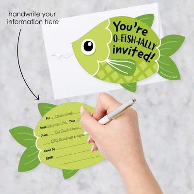 Let’s Go Fishing Fill-In the Blank Invitation Set INCLUDES 12 fish party invitations and 12 premium white envelopes. Let’s Go Fishing fill-in invitation is perfect for any event. The fish theme is great for a baby shower or birthday party. Fish party invitations SIZE 7 inches by 5 inches. The included envelopes measure 5 inches by 7 inches. The back of each Let’s Go Fishing baby shower or birthday party invitation has space to add your party details: For: Date: Time: Place: Given By: RSVP: PREMIUM PARTY INVITATIONS: Fish party invitation is professionally printed on heavy-duty card stock paper with a photo-like shine. They are individually inspected, then carefully packaged with our exclusive squiggle flap envelopes, making this Let’s Go Fishing stationary set a must-have for any baby shower or birthday party. MADE IN THE USA: Let’s Go Fishing – Baby Shower or Birthday Party Invitations are designed and manufactured at our Wisconsin facility using materials that are Made in the USA.
