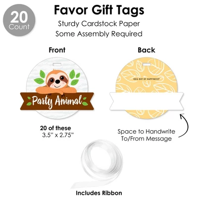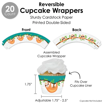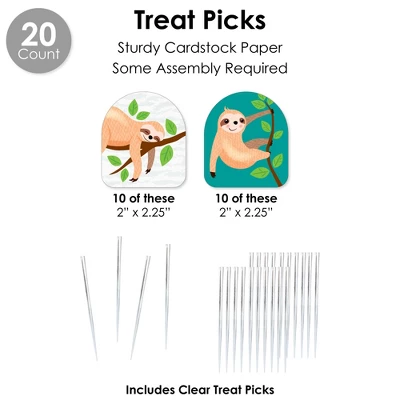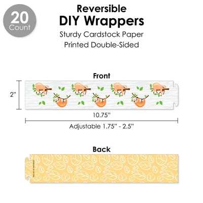 DIY WRAPPERS includes: 20 total reversible wrappers that are 10.75” wide x 2” tall. When wrapped, they can accommodate favors 1.75” to 2.5” in diameter. Professionally printed double-sided on sturdy cardstock paper, these wrappers for a Birthday or Baby Shower Party are easy to secure on a variety of items like beverage containers, vases, napkins, and more by wrapping around and sliding the tab into the appropriate slit. CUPCAKE WRAPPERS includes: 20 total cupcake wrappers that adjust to fit 1.75” – 2.5” wide x 1.75” tall. Professionally printed double-sided on sturdy cardstock paper, Let’s Hang – Sloth cupcake wrappers will fit over cupcake liners on standard and medium-sized cupcakes and are reversible for a coordinated look. Secure cupcake wrappers by sliding the tab into appropriate slit. TREAT PICKS includes: 20 total shaped cut-outs – 2” wide x 2.25” tall and clear treat picks – 4” tall. Sloth Themed paper cut-outs come in 2 designs that are a great for styling food being served. Assembly stickers are included for easy DIY required assembly. FAVOR GIFT TAGS includes: 20 total gift tag paper cut-outs – 3.5” wide by 2.75” tall and satin ribbon. Professionally printed double-sided on sturdy cardstock paper, write a special message in the blank space on the back side tags. STRAW DECOR includes 20 total shaped cut-outs with 2 designs -10 count each, size 2.25” wide by 2.25” tall and chevron striped paper straws – 7.75” tall. Shaped cut-outs are professionally printed on sturdy cardstock paper. Favor party pack is designed and manufactured at our Wisconsin facility using materials that are Made in the USA.