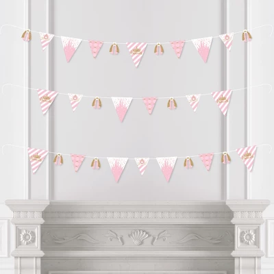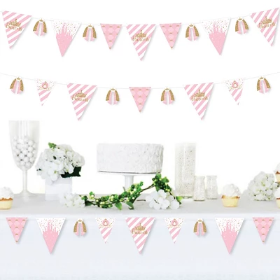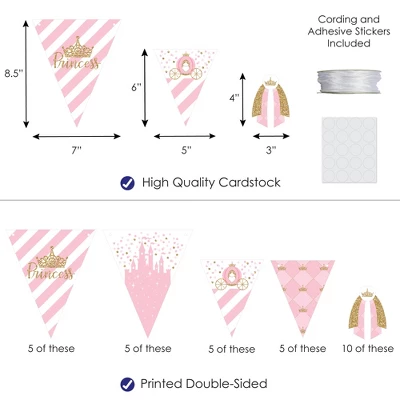 Princess Triangle Banner includes a set of 20 paper triangle flags, 10 paper tassel shapes, satin cording, and adhesive stickers. Make a fun garland banner that will look amazing at your Baby Shower or Birthday Party. Playful Party Decor: Little Princess Crown paper triangles will look wonderful in all areas of your celebration. Hang the banner against the wall for a festive look. Use it as part of your photo booth backdrop or attach the banner along your table for a charming and easy decoration. DIY Assembly: Little Princess Crown banner is easy to put together. Simply string the cording through the punched holes on each pennant piece and add the paper tassels using the included adhesive dots. Secure the triangle banner by tying the ends into a knot and hang the banner using an included clear circle sticker. Instructions included on packaging. High-Quality Supply: Little Princess Crown flags and paper tassels are professionally printed double-sided on heavy-duty cardstock paper with a photo-like shine. Large pennants measure 7 inches wide by 8.5 inches tall, small pennants measure 5 inches wide by 6 inches tall, and paper tassels measure 3 inches wide by 4 inches tall. Made In The USA: Little Princess Crown Triangle Banner is designed and manufactured at our Wisconsin facility using materials that are Made in the USA. Little Princess Crown Triangle Banner uses a No-Mess Glitter Print: Our garland banner is designed with a printed image of glitter, eliminating glitter flake while maximizing bling effect!
