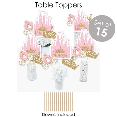 BUNTING BANNER includes: letter and themed pennants. Each pennant measures 8.5″ high x 5.5″ wide. Pennants are numbered in sequence and ribbon is included for easy assembly. PARTY DECORATION SWIRLS includes: 4 different shapes, 10 count per shape, that hang below an accordion-style spiral. Professionally printed double-sided, each decoration swirl in the 40-piece set has a pre-cut hole for easy assembly using the included clear hooks. Party decoration swirls will arrive flat. TABLE TOPPERS includes: 15 Princess Castle centerpiece sticks in three different shapes, each professionally printed double-sided. To use as centerpieces or photo props, wooden dowels and assembly stickers are included. CIRCLE CONFETTI includes: three different sizes of circles – 12 small circles, size 2.75″, 9 medium circles, size 4.25″, and 6 large circles, size 5.5″. Professionally printed double-sided with coordinating pink princess designs, circle confetti can be scattered around your table. FAVOR KIT: CANDY STICKERS includes: 2 sheets mini candy bar wrappers (total 40), 2 sheets round candy stickers (total 216), 2 sheets circle stickers (total 48). Easy assembly with this peel and stick favor kit. Simply center and press stickers onto your favorite candies to style candy buffets or decorate take-home favors for party guests. Note: Candy is not included.