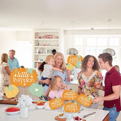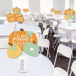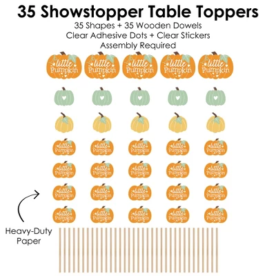 Little Pumpkin Showstopper Table Toppers INCLUDE: 35 heavy-duty paper centerpiece cut-outs in our Orange & Teal Pumpkin theme. Each cut-out shape is printed double-sided and includes 35 wooden dowel sticks. DIY assembly is required. EASY TABLE DECORATIONS: Little Pumpkin showstopper party centerpieces come with a variety of fun shapes and in the perfect sizes to create impressive tabletop decorations. Place assembled centerpiece sticks into jars or floral arrangements for that showstopper wow-factor. DIY PARTY CENTERPIECES: Little Pumpkin party centerpiece kit arrives with wooden dowels and reinforcing stickers for easy DIY assembly. Simply press the included reinforcing sticker onto one dowel stick, near the end of dowel. Then, firmly press dowel to the back of a table topper shape. HIGH-QUALITY PARTY SUPPLIES: Autumn Pumpkin Party showstopper table toppers are professionally printed double-sided on sturdy cardstock paper with a photo-like shine. They are individually inspected and carefully packaged by hand. Showstopper table toppers will arrive unassembled, leaving your DIY Fall Birthday Party or Baby Shower idea options endless. MADE IN THE USA: Little Pumpkin showstopper table toppers are designed and manufactured at our Wisconsin facility using materials that are Made in the USA.