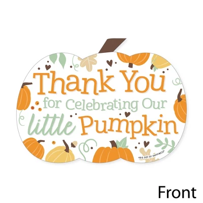 Shaped Thank You Cards Set INCLUDES 12 Little Pumpkin Fall Birthday Party or Baby Shower thank you cards and 12 premium white envelopes. Orange & Teal Pumpkin Shaped Thank You Cards are the perfect end to any event. Pumpkin party thank you note cards SIZE 7 inches by 5 inches. The included envelopes measure to fit 7 inches by 5 inches cards. The back of each Little Pumpkin Fall Birthday Party or Baby Shower thank you has space to write a personal message of thanks. PREMIUM PARTY THANK YOU CARDS: Little Pumpkin party thank you cards are professionally printed on heavy-duty cardstock paper with a photo-like shine. They are individually inspected, then carefully packaged with our exclusive squiggle flap envelopes, making this Little Pumpkin stationery set a must-have for any Fall Birthday Party or Baby Shower. MADE IN THE USA: Little Pumpkin Party Thank You Cards are designed and manufactured at our Wisconsin facility using materials that are Made in America.