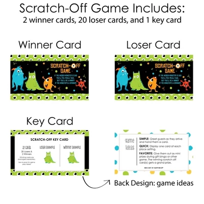 Monster Bash Scratch-Off Cards INCLUDES 22 baby shower or birthday party game cards: 20 “loser” cards and 2 “winner” cards. FUN PARTY GAME: Monster Bash scratch-off cards will be enjoyed by baby shower or birthday party guests of all ages. Each game card measures 2.75″ tall x 4.75″ wide. Winner and loser game cards are packaged separately so it is easy to pre-select the game winners if you choose. 3 WAYS TO PLAY: Simple – Greet guests as they arrive and hand them a scratch-off card. Quick – Display one scratch-off card at each place setting and have guests play before eating. Favorite – Give scratch-off cards out as mini prizes during other party games. The winning scratch off card(s) gets a grand prize. HIGH-QUALITY PARTY SUPPLIES: Monster Bash Scratch-Off Cards are professionally printed on heavy-duty cardstock paper with a photo-like shine. They are individually inspected and carefully packaged by hand, with winner cards and loser cards clearly marked. This fun baby shower or birthday party game will arrive ready to use at your party. MADE IN THE USA: Monster Bash – Little Monster Birthday Party or Baby Shower Game Scratch Off Cards are designed and manufactured at our Wisconsin facility using materials that are Made in the USA.
