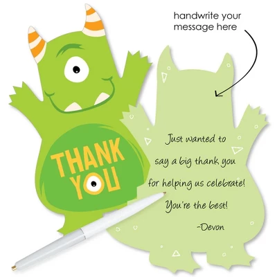 Shaped Thank You Cards Set INCLUDES 12 Monster Bash baby shower or birthday party thank you cards and 12 premium white envelopes. Monster Bash Shaped Thank You Cards are the perfect end to any event. Monster Bash party thank you note cards SIZE 5 inches by 7 inches. The included envelopes measure to fit 5 inches by 7 inches cards. The back of each Monster Bash baby shower or birthday party thank you has space to write a personal message of thanks. PREMIUM PARTY THANK YOU CARDS: Monster Bash party thank you cards are professionally printed on heavy-duty cardstock paper with a photo-like shine. They are individually inspected, then carefully packaged with our exclusive squiggle flap envelopes, making this Monster Bash stationary set a must-have for any baby shower or birthday party. MADE IN THE USA: Monster Bash Party Thank You Cards are designed and manufactured at our Wisconsin facility using materials that are Made in America.