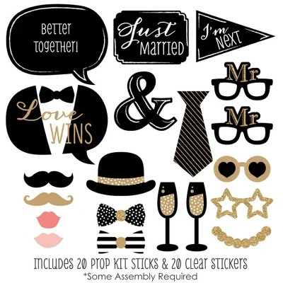 20-Piece LGBTQ Photo Booth Props Kit INCLUDES 20 Mr. & Mr. – Gold photo booth props, 20 sticks and adhesives for assembly. EASY ASSEMBLY: Simply attach the printed DIY photo booth props to the sticks with included adhesive and reinforcing stickers. PERFECT FOR ANY CROWD! Photo booth props are fun wedding party supplies for adults and kids – everyone will love the funny faces on these Mr. & Mr. – Gold photo booth props. Take entertaining and shareable party photos of your friends and family while making memories with these stylish photo booth props! WEDDING DECORATION IDEAS: There are many fun ways to use these cute photo booth props! Use as intended at your wedding and take party photos to share; add them to vases and floral arrangements as a fun black and gold centerpiece; or accent your gay wedding theme by displaying them in decorative candy jars! HIGH-QUALITY PARTY SUPPLIES: Mr. & Mr. – Gold photo booth props are professionally printed on thick cardstock paper. They will arrive cut out and ready to assemble with the included sticks and adhesives. Mr. & Mr. – Gold photo booth props use a No-Mess Glitter Print: Our photo booth props are designed with a printed image of glitter, eliminating glitter flake while maximizing bling effect! MADE IN THE USA: Mr. & Mr. – Gold – Gay Wedding LGBTQ Photo Booth Props Kit is designed and manufactured at our Wisconsin facility using materials that are Made in the USA.