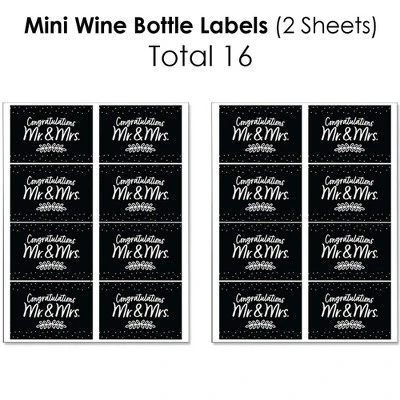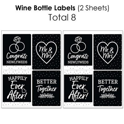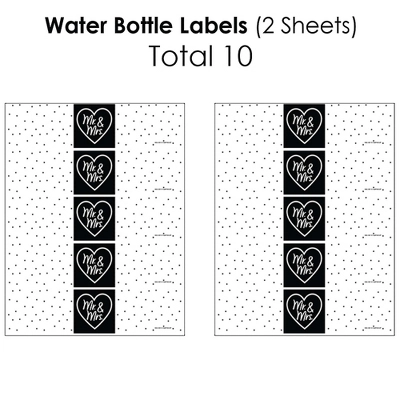 Beverage Bar Kit INCLUDES: 2 sheets mini wine bottle labels (total 16), 2 sheets wine bottle labels (total 8), 2 sheets water bottle labels (total 10). This 34-piece kit is perfect for styling a Mr. and Mrs. Black and White event. HIGH-QUALITY: Beverage Bar Labels are professionally printed on waterproof adhesive paper with a glossy coating. Mini Wine Bottle Labels SIZE 3.75 inches wide x 2.6 inches tall. Wine Bottle Labels SIZE 4 inches wide x 5 inches tall, fits most standard 750 ml wine bottles. Water Bottle Labels SIZE 8.5 inches wide x 2 inches tall. EASY ASSEMBLY: Prepare your bottles or containers by ensuring they are room temp and dry. For best results, remove original label. First, peel sticker label from sheet and pick one label edge to start. Once the edge is straight, firmly attach and slowly roll the bottle while smoothing the entire label. Beverage Bar Kit Labels are waterproof and can be used on bottles that will be chilled, just be sure to apply prior to chilling. UNIQUE PARTY SUPPLIES: Wow your party guests with a black wedding coordinated beverage bar by placing labels on drinks to be served. Just add labels to drinks while dry. Mr. and Mrs. Black and White Labels can also be used on cylinder containers to create centerpieces. Use decorative labels to create fun and unique party favors or gifts for your Wedding party. MADE IN THE USA: Beverage Bar Kit labels are designed and manufactured at our Wisconsin facility using materials that are Made in the USA. Please Note: Wine and Water in images is not included.