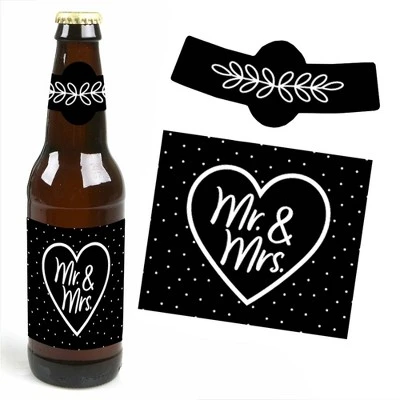 Mr. and Mrs. Black and White Beer Gift Set INCLUDES 6 beer bottle sticker labels & 6 bottle neck labels in the black and white theme, as well as 1 six-pack carrier with 4 appreciation stickers for decoration. Mr. and Mrs. Black and White Beer bottle stickers each SIZE 3.5″ wide x 3″ tall, perfect for standard beer bottles or similarly sized soda bottles; Beer collar neck labels measure 3.5″ long x 1.5″ wide at the center. Beer bottle labels are quick to apply and will give your wedding or bridal shower gift a personal touch! HIGH QUALITY PARTY SUPPLIES: Mr. and Mrs. Black and White beer bottle labels are professionally printed on a sticker paper with a glossy coating. They are waterproof and can be used on bottles that will be chilled, just apply prior to chilling. Use the beer kit as the perfect party gift or at a wedding or bridal shower beverage bar for an impressive, coordinated display. EASY TO USE: Prepare your bottles by ensuring they are room temperature. Removing the original bottle label is not necessary but is preferred. Carefully peel one sticker label from the backing and adhere to a bottle, starting at the edge and rolling to the opposite edge. Press down to smooth. Add the bottle neck label and place the completed bottle into the kraft paper carrier. Continue until all bottles are done. Complete the beer gift kit by adding the remaining 4 stickers to the sides. MADE IN THE USA: Mr. and Mrs. Black and White – Party Beer Bottle Labels and Carrier is designed and manufactured at our Wisconsin facility using materials that are Made in the USA. Please Note: Beer in image is not included.