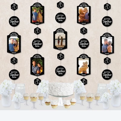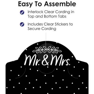 Big Dot of Happiness Mr. and Mrs. – Black and White Hanging Vertical Photo Garland includes 35 shaped pieces, 1 roll of clear cording, and assembly stickers that you can use to transform your Wedding or Bridal Shower into an unforgettable celebration. With the 10 double-sided photo frames, insert 4 x 6 portrait photos of your guest of honor into the front and back sides. You can display up to 20 pictures using the multiple tabs to secure them into place, allowing your photo garland to look great from all angles. Delightful Decor: Mr. and Mrs. – Black and White Vertical Garland can be displayed at any length you choose for a dynamic look at your celebration. You can create a backdrop, hang it from the ceiling, or attach it above your dessert table—the possibilities are endless. DIY Assembly: Start by placing your 4 x 6 portrait pictures on the front and back sides of the photo frame cut-out pieces. Then, plan your display by laying the cut-out pieces on a flat surface. Interlock the clear cording into each cut-out piece and secure it with the provided clear stickers. Instructions are also included on the packaging. High-Quality Supply: Mr. and Mrs. – Black and White vertical hanging garland pieces are professionally printed double-sided on heavy-duty cardstock paper. Photo frames measure 5.5 inches wide x 9.25 inches tall. Circle pieces measure 4.25 inches in diameter. Hexagon cut-outs measure 3 inches wide by 3.25 inches tall. Made In The USA: Mr. and Mrs. – Black and White Photo Vertical Garlands are designed and manufactured at our Wisconsin facility using materials that are Made in the USA.