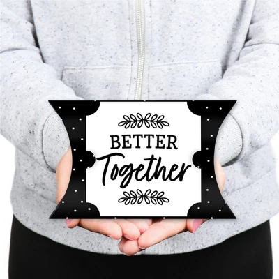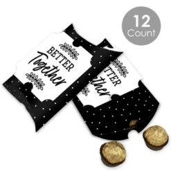 Mr. and Mrs. Large Pillow Boxes INCLUDES 12 boxes and 12 decorative top pieces. Boxes arrive flat and require some easy assembly. These Black and White favor gift boxes make great giveaways at your next Bridal Shower or Wedding. BOX-ERRIFIC: Mr. and Mrs. Large Pillow Boxes are SIZE 7 inches long x 4.5 inches wide. Fully assembled boxes have a 1.75-inch-wide opening on both ends and are 5 inches deep for storing items inside. Made of heavy-duty, these loot favor gift boxes can be filled with wrapped treats, trinkets, or small mementos; boxes are suitable for all ages. These boxes are fun and artful, making them perfect accents at any party table setting. EASY ASSEMBLY: Black and White Large Pillow Boxes require some assembly before use. Start by securing a top piece to a pillow box by tucking top piece under both tabs on box. Gently squeeze box open and fold ends down in numerical order. NOTE: Top pieces can be displayed horizontally or vertically on boxes. PREMIUM FAVOR BOXES: Mr. and Mrs. Large Pillow Boxes are professionally printed on heavy-duty paper with a photo-like shine. The ends have full overlapping flaps; no tape or extra materials needed. They are individually inspected and carefully packaged. Treats, trinkets, and small mementos not included. MADE IN THE USA: Mr. and Mrs. Large Pillow Boxes are designed and manufactured at our Wisconsin facility using materials that are Made in the USA.