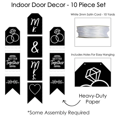 Mr. and Mrs. Black and White Indoor Door Decor INCLUDES: 10 heavy-duty paper pieces to create 3 vertical banners and 10 yards white 2mm satin cord. Easy assembly required. FUN PARTY BANNER: Vertical hanging door banners will create that wow-factor at your bridal shower or wedding. Hang at the entrance of your event, over the food or gift table, or any open wall space to create a fun focal point. WALL DECORATION KIT: All banner sign pieces SIZE 7.5 inches wide x 10.75 inches. Each piece has pre-cut holes for easy DIY hanging with the included 10 yards of white 2mm satin cord. This DIY banner decor kit allows you to choose the spacing between each piece and string the cording through at your desired length. Clear adhesive stickers are also included to secure cording onto the back of each banner piece. PREMIUM PARTY SUPPLIES: Mr. and Mrs. Black and White hanging vertical door banner decoration pieces are professionally printed one-sided on heavy-duty cardstock paper. Each banner piece is individually inspected and carefully packaged by hand. Black and white wall decoration kit requires some easy assembly. Follow the number sequence on the back of each banner piece and simply string the included cording through the pre-cut holes. MADE IN THE USA: Mr. and Mrs. Black and White paper door banner decoration kit is designed and manufactured at our Wisconsin facility using materials that are Made in the USA.