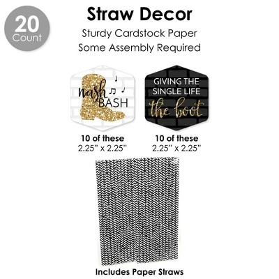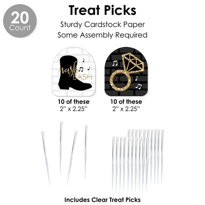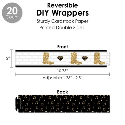 DIY WRAPPERS includes: 20 total reversible wrappers that are 10.75″ wide x 2″ tall. When wrapped, they can accommodate favors 1.75″ to 2.5″ in diameter. CUPCAKE WRAPPERS includes: 20 adjustable cupcake wrappers 1.75″ – 2.5″ wide x 1.75″ tall. Nash Bash cupcake wrappers will fit over cupcake liners on standard and medium-sized cupcakes and are reversible for a coordinated look. TREAT PICKS includes: 20 cut-outs 2″ wide x 2.25″ tall & clear treat picks 4″ tall. Black & Gold Music Themed paper cut-outs come in 2 designs. Assembly stickers are included for easy DIY required assembly. FAVOR GIFT TAGS includes: 20 gift tags 3.5″ wide by 2.75″ tall & satin ribbon. Write a special message on the back side of Nashville gift tags for a personal touch. STRAW DECOR includes 20 total shaped cut-outs with 2 designs – 10 count each, size 2.25″ wide by 2.25″ tall and chevron striped paper straws – 7.75″ tall. Shaped cut-outs are professionally printed on sturdy cardstock paper. For easy assembly, create your stylish drinks by attaching Black & Gold Music Themed shaped cut-outs to paper straws with clear stickers included. Favor party pack is designed and manufactured at our Wisconsin facility using materials that are Made in the USA. Favor pack uses a No-Mess Glitter Print: Our party kits are designed with a printed image of glitter, eliminating glitter flake while maximizing bling effect!