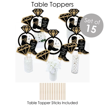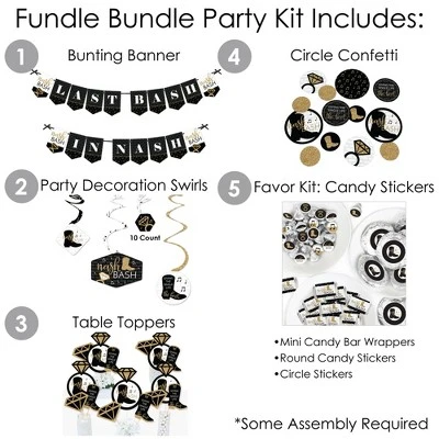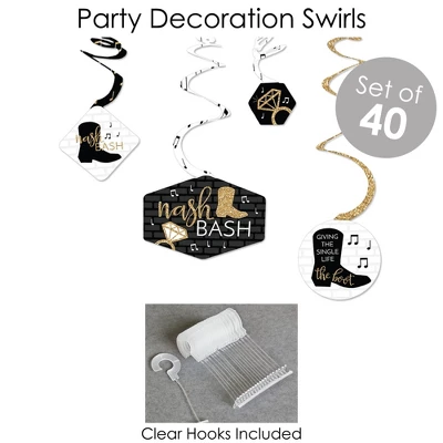 BUNTING BANNER Includes: letter and themed pennants. Each pennant measures 8.5” high x 5.5” wide. Pennants are numbered in sequence and ribbon is included for easy assembly. PARTY DECORATION SWIRLS Includes: 4 different shapes, 10 count per shape, that hang below an accordion-style spiral. Professionally printed double-sided, each decoration swirl in the 40-piece set has a pre-cut hole for easy assembly using the included clear hooks. Party decoration swirls will arrive flat. TABLE TOPPERS Includes: 15 Nash Bash centerpiece sticks in three different shapes, each professionally printed double-sided. To use as centerpieces or photo props, wooden dowels and assembly stickers are included. CIRCLE CONFETTI Includes: three different sizes of circles – 12 small circles, size 2.75”, 9 medium circles, size 4.25”, and 6 large circles, size 5.5”. Professionally printed double-sided with coordinating Black & Gold Music Themed designs, circle confetti can be scattered around your table. FAVOR KIT: CANDY STICKERS Includes: 2 sheets mini candy bar wrappers (total 40), 2 sheets round candy stickers (total 216), 2 sheets circle stickers (total 48). Easy assembly with this peel and stick favor kit. Simply center and press stickers onto your favorite candies to style candy buffets or decorate take-home favors for Bachelorette Party guests. Note: Candy is not included.Nash Bash party decoration kit uses a No-Mess Glitter Print: Our party kits are designed with a printed image of glitter, eliminating glitter flake while maximizing bling effect!