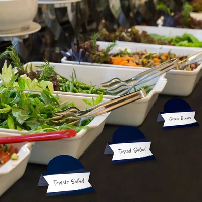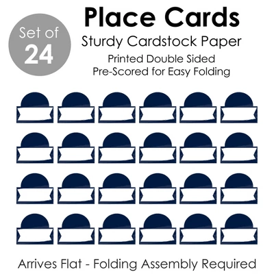 Navy Blue Elegantly Simple Place Cards INCLUDES 24 individual cards that measure 3.5” wide x 2.5” tall when assembled. Easy to use, these tabletop accents are perfect to use at your next Baby or Bridal Shower, Anniversary, Retirement, or Birthday Party. VERSATILE IN USE: Whether it’s a small party or large gathering, the Royal Blue Place Cards can be used in a variety of ways. Handwrite words in the blank space and then set them on the buffet table, as part of a place setting, or consider using them for an icebreaker activity. EYE-CATCHING DESIGN: Featuring crisp graphics with an innovative cut design, Navy Blue Elegantly Simple Place Cards will easily draw in attention without taking up too much space. To assemble, push back the top outer edge, revealing the half-circle top. Fold along the pre-scored line in the center to create the tent shape, and then display! HIGH-QUALITY: Royal Blue Place Cards are professionally printed double-sided on sturdy cardstock paper with a photo-like shine. They are individually inspected and carefully packaged by hand. Place Cards will arrive flat with some folding assembly required. MADE IN THE USA: Navy Blue Elegantly Simple Place Cards are designed and manufactured at our Wisconsin facility using materials that are Made in the USA.