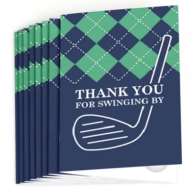 Par-Tee Time Thank You Note Card Set INCLUDES 8 sports party thank yous and premium white envelopes. Golf thank you notes are perfect for any event. The sports theme is great for a birthday or retirement party. Par-Tee Time – Golf party note cards SIZE 5.5 inches by 3.75 inches, folded. The included envelopes measure 5.75 inches by 3.75 inches. The inside of each Par-Tee Time – Golf thank you card stationery has a fun graphic as well as space to write a special note to friends and family. PREMIUM THANK YOU CARDS: Par-Tee Time – Golf party thank you cards are professionally printed on heavy-duty cardstock paper with a photo-like shine. They are hand-folded and individually inspected, then carefully packaged with our exclusive squiggle flap envelopes, making this sports stationary set a must-have for birthday or retirement parties. MADE IN THE USA: Par-Tee Time – Golf – Birthday or Retirement Party Thank You Cards are designed and manufactured at our Wisconsin facility using materials that are Made in the USA.