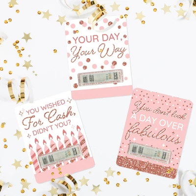 Pink Rose Gold Birthday Funny Money Cards includes a set of 6 assorted money greeting cards and 6 plastic domes with adhesive backings. Funny money cards come with hilarious phrases that will make your recipient laugh and are perfect for a Birthday Party gift. Cheerful Gift: Delight your recipient with some cold, hard cash! Rose gold funny money card comes with space to write a personal message, making this a fun yet heartwarming way to show your loved one how much you care. Pink Rose Gold Birthday cards measure 4 inches wide x 5 inches tall when folded and 11 inches tall when open. Plastic domes measure 3.25 inches Wide x 1.25 inches tall. Easy Assembly: To assemble your Rose gold cash holder card, peel back the adhesive backing on the plastic dome. Roll your cash and insert it into the dome. Next, attach the dome with money onto the inside of the card, placing it on the rectangular guide. Then, finish by folding the card and folding the bottom tab to the back of the card and inserting it into the slit to secure it shut. High-Quality Supply: Pink Rose Gold Birthday DIY money holders are professionally printed double-sided on heavy-duty cardstock paper. Cards come with a photo-like shine on the outside. The inside will be matte, making it easy to handwrite your personal message. The clear plastic domes come in a lip balm pouch shape and are easy to use with a peel-and-stick adhesive backing. Assembled In The USA: Pink Rose Gold Birthday Funny Money Cards are designed and manufactured at our Wisconsin facility using materials that are Made in the USA – Plastic Domes Made in China. Pink Rose Gold Birthday Funny Money Cards uses a No-Mess Glitter Print: Our cards are designed with a printed image of glitter, eliminating glitter flake while maximizing bling effect!