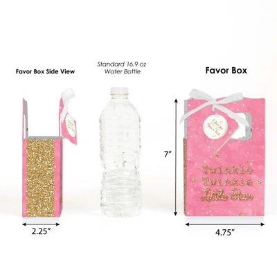 Pink Twinkle Twinkle Little Star Favor Boxes INCLUDES 12 pink and gold star party favor bags, 12 gift tags, and coordinating satin ribbon. Classic favor boxes are a party must-have. Pink and gold star theme party supplies are great for a baby shower or birthday party. Pink Twinkle Twinkle Little Star Party Favor Boxes SIZE 4.75 inches wide x 4.75 inches high x 2.25 inches deep (fillable inside space) with a total height of 7 inches, including the handle. The coordinating gift tags and ribbon makes these 12 star and moon party favor boxes a complete treat bag party kit that everyone will love. PARTY SUPPLIES: Baby shower or birthday party favor boxes will hold a variety of treats, prizes and party favors for your guests. Fill them with baked goodies, party trinkets or thank you gifts for adorable pink little star party favors! PREMIUM PARTY FAVOR BOXES: Pink Twinkle Twinkle Little Star party favor boxes are professionally printed on heavy-duty cardstock paper with a photo-like shine. They are hand-folded and individually inspected, then carefully packaged. Favor boxes will arrive flat, partially assembled. Finishing assembly is required but it is easy. Once assembled, add the “I Love you to the Moon and Back” gift tag with the included ribbon for perfect party favors! MADE IN AMERICA: Pink Twinkle Twinkle Little Star – Baby Shower or Birthday Party Favor Boxes are designed and manufactured at our Wisconsin facility using materials that are Made in America. Pink Twinkle Twinkle Little Star Favor Boxes use a No-Mess Glitter Print: Our favor boxes are designed with a printed image of glitter, eliminating glitter flake while maximizing bling effect!