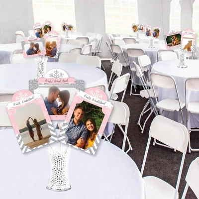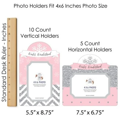 Pink Winter Wonderland Photo Table Toppers INCLUDE 15 sturdy and professionally printed paper photo holders and 15 table topper sticks. Each photo holder has pre-cut tabs to display your 4×6 photos vertically or horizontally. Clear stickers are included to easily assemble the stick to photo holder. DIY CENTERPIECE STICKS: Create picture-perfect centerpieces for your Snowflake Holiday Party or Winter Wedding with Pink Winter Wonderland Photo Table Toppers. Each photo holder has 4 pre-cut slits to tab your 4×6 photos in place. (Note: Your photo will tab through back design of photo holder.) Then attach one table topper stick to one completed photo holder piece with the included clear stickers. EASY PINK SNOWFLAKE DECOR: Photo Table Topper decorations can be used as centerpieces when attached to the included sticks and inserted into vases or floral arrangements. They easily accent your Snowflake Party candy buffet when you add them to apothecary jars. Photo Table Toppers are a great addition to any Snowflake Holiday Party, Winter Wedding, Birthday Party, or Baby Shower and a fun way to proudly show off the guest of honor. PREMIUM PARTY DECORATION: Pink Winter Wonderland Snowflake Party Photo Table Toppers are professionally printed double-sided on heavy-duty cardstock paper. This set of paper picture frames includes 10 count vertical photo display SIZE 5.5 inches wide x 8.75 inches tall and 5 count horizontal photo display SIZE 7.5 inches wide x 6.75 inches tall. Each photo holder fits your own 4×6 photo size. The included 15 table topper sticks each SIZE 12 inches tall. MADE IN THE USA: Pink Snowflake Photo Table Toppers are designed and manufactured at our Wisconsin facility using materials that are Made in the USA. Photo Table Toppers uses a No-Mess Glitter Print: Our Photo Holders are designed with a printed image of glitter, eliminating glitter flake while maximizing bling effect!