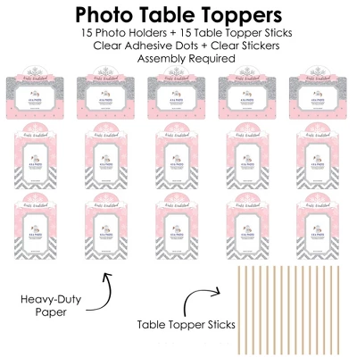 - Includes 15 Photo Holders, 15 Table Topper Sticks, & Clear Assembly Stickers