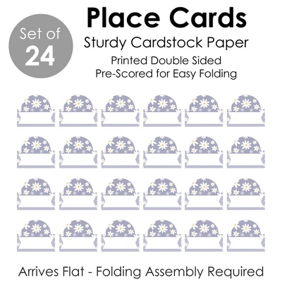 Purple Daisy Flowers Place Cards INCLUDES 24 individual cards that measure 3.5″ wide x 2.5″ tall when assembled. Easy to use, these tabletop accents are perfect to use at your next Floral Party. VERSATILE IN USE: Whether it’s a small party or large gathering, the Boho Floral Place Cards can be used in a variety of ways. Handwrite words in the blank space and then set them on the buffet table, as part of a place setting, or consider using them for an icebreaker activity. EYE-CATCHING DESIGN: Featuring crisp graphics with an innovative cut design, Purple Daisy Flowers Place Cards will easily draw in attention without taking up too much space. To assemble, push back the top outer edge, revealing the half-circle top. Fold along the pre-scored line in the center to create the tent shape, and then display! HIGH-QUALITY: Pastel Daisy Place Cards are professionally printed double-sided on sturdy cardstock paper with a photo-like shine. They are individually inspected and carefully packaged by hand. Place Cards will arrive flat with some folding assembly required. MADE IN THE USA: Purple Daisy Flowers Place Cards are designed and manufactured at our Wisconsin facility using materials that are Made in the USA.