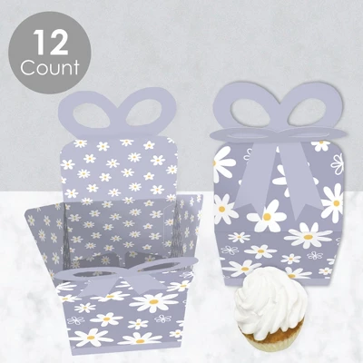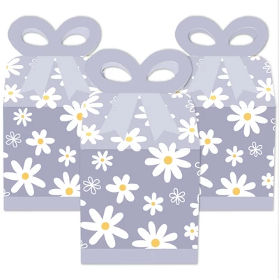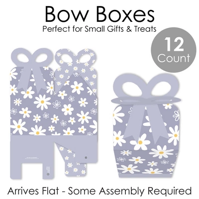 Bow Boxes INCLUDE: 12 Boho Floral-themed square favor gift boxes. Each box SIZE measures 3.5 inches length x 3.5 inches width x 7 inches height. Bow boxes are ideal for small gifts and treats that are under 3.5 inches tall (height for storing items in closed box). When assembled and closed, each box creates a 3D paper bow-shaped top with a square bottom. CUTE GIFT BOXES: This small, closed favor box can be filled with homemade treats (fun cupcake box), party trinkets, or thank you gifts. At the party, have each guest fill their Pastel Daisy bow box with snacks from a candy buffet or use as a party loot box. Guests will have fun guessing what surprise each favor gift box contains. PREMIUM PARTY SUPPLY: Bow boxes are professionally printed and double-sided on heavy-duty cardstock paper, with a photo-like shine. They are hand-folded, individually inspected, and then carefully packaged. EASY ASSEMBLY: Purple Daisy Flowers bow boxes will arrive flat. Each bow box has crease lines and numbered tabs for easy folding. Finish the DIY assembly by interlocking top of box to create a three-dimensional bow. Packaging will include assembly instructions. MADE IN THE USA: Pastel Daisy Floral Party bow boxes are designed and manufactured at our Wisconsin facility using materials that are Made in the USA.