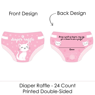 Purr-fect Kitty Cat – Pink Diaper Shaped Raffle Ticket Inserts INCLUDES 24 cards with instructions for a diaper raffle game and space for guests to write their name. FUN BABY SHOWER GAME: Baby Shower guests will love playing a diaper raffle – it’s easy to do and helps Mommy-to-Be stock up on diapers before her baby arrives. Diaper raffle tickets are a great addition to any baby shower invitations. Add them to invites for traditional baby shower or a baby sprinkle, give them to Dad’s friends for a diaper party, or host an event with coworkers. HOW TO PLAY: Add a Diaper Raffle Ticket to each baby shower invitation, telling guests to bring one package of diapers and the Diaper Raffle Ticket with their name on it. At the baby shower, have a fun basket or box at the gift table and direct guests to drop their Diaper Raffle Tickets into it. Give your guests ample time to arrive and then have a drawing for the prize winner. You can have one grand prize winner or numerous little ones. Either way, a diaper raffle is a fun way to get everyone in on the games and an easy way to get the parents ready for baby! HIGH-QUALITY PARTY SUPPLIES: Diaper Shaped Raffle Ticket Inserts are professionally printed on heavy-duty cardstock paper with a photo-like shine. They are individually inspected and carefully packaged by hand. This fun baby shower or gender reveal party game will arrive ready to use at your party. Each diaper shaped raffle ticket measures 4” wide x 2.75” tall. MADE IN THE USA: Purr-fect Kitty Cat – Diaper Shaped Raffle Ticket Inserts – Baby Shower Game is designed and manufactured at our Wisconsin facility using materials that are Made in the USA.