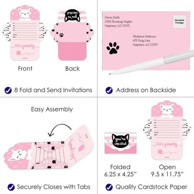 Purr-fect Kitty Cat Fold and Send Invitations includes a set of 8 Baby Shower or Birthday Party invitations. This all-in-one set of invites can be folded into an envelope and comes with clear stickers for secure delivery. Splendid Surprise: Excite your partygoers with these unique and charming invites that turn into envelopes. Kitten Meow invitations include fill-in-the-blank space to add your party details. Once assembled, you can directly hand the invites to your recipients or write out the address information on the backside and send your invite via snail mail. Easy Assembly: To transform your invite into an envelope, begin by folding the sides inward. Next, fold and attach the bottom flap by inserting the tabs into the slots of the side flaps. Finally, fold the top flap over and insert its tabs into the slots. Seal your envelope shut using a clear sticker. Practice assembling using the instruction card included. Premium Party Supply: Purr-fect Kitty Cat party invitations are professionally printed double-sided on quality cardstock paper with a photo-like shine. When folded, invite cards measure 6.25 inches wide x 4.25 inches tall, and when open, cards measure 9.5 inches wide x 11.75 inches tall. Made In The USA: Kitten Meow Fold and Send Invitations are designed and manufactured at our Wisconsin facility using materials that are Made in the USA.