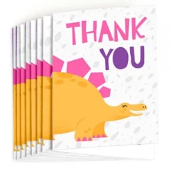 Roar Dinosaur Girl Thank You Note Card Set INCLUDES 8 little dinosaur party thank yous and premium white envelopes. Roar Dinosaur Girl thank you notes are perfect for any event. The dino theme is great for a baby shower or birthday party. Roar Dinosaur Girl note cards SIZE 5.5 inches by 3.75 inches, folded. The included envelopes measure 5.75 inches by 3.75 inches. The inside of each Roar Dinosaur Girl thank you card stationery has a fun graphic as well as space to write a special note to friends and family. PREMIUM THANK YOU CARDS: Roar Dinosaur Girl thank you cards are professionally printed on heavy-duty card stock paper with a photo-like shine. They are hand-folded and individually inspected, then carefully packaged with our exclusive squiggle flap envelopes, making this pink dinosaur stationary set a must-have for baby shower or birthday parties. MADE IN THE USA: Roar Dinosaur Girl – Baby Shower or Birthday Party Thank You Cards are designed and manufactured at our Wisconsin facility using materials that are Made in the USA.