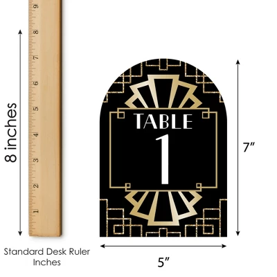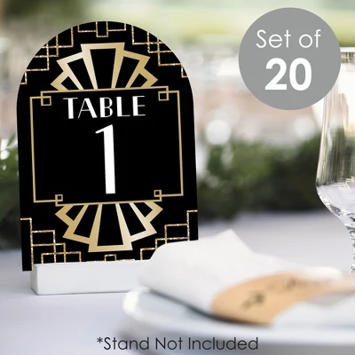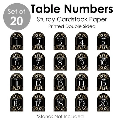Roaring 20’s Table Numbers INCLUDES table cards numbered from 1-20. Each card measures 5” wide x 7” tall. These tabletop accessories are perfect for your Wedding Receptions, Parties, or Events and will fit great with a stand of your choice. EASY DECOR: Help guests locate their seats at your celebration all the while displaying a lovely table setting! Pair table numbers with vases and flower arrangements or make them standout when you use it as your main centerpiece. From formal events to casual get-togethers, the 1920s Art Deco Jazz Table Numbers is an excellent addition to your table setup. STYLISH DESIGN: With crisp graphics and an elegant arch cut-out design, the Roaring 20’s Table Numbers can be used at a variety of celebrations such as weddings, birthdays, baby showers, and more! Simply display by placing the removeable table number card with your own frame, stand, or holder to complete your look! Display at any Baby or Bridal Shower, Anniversary, Retirement, or Birthday Party! HIGH-QUALITY: 1920s Art Deco Jazz Table Numbers are numbered 1 through 20 and are professionally printed double-sided on sturdy cardstock paper, allowing for guests to find their assigned tables easily. They are individually inspected and carefully packaged by hand. Stand not included. MADE IN THE USA: Roaring 20’s Table Numbers are designed and manufactured at our Wisconsin facility using materials that are Made in the USA.