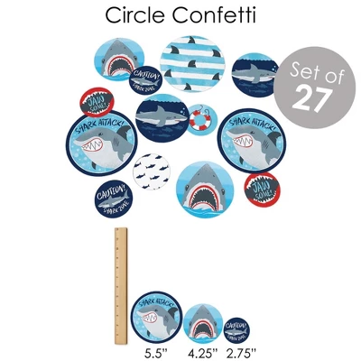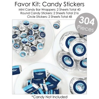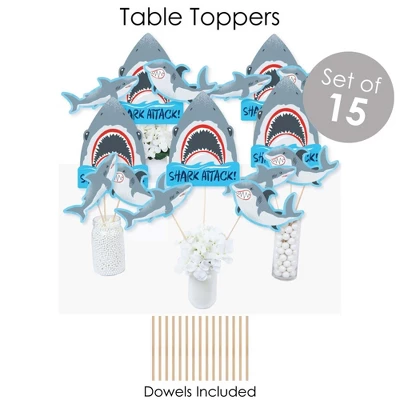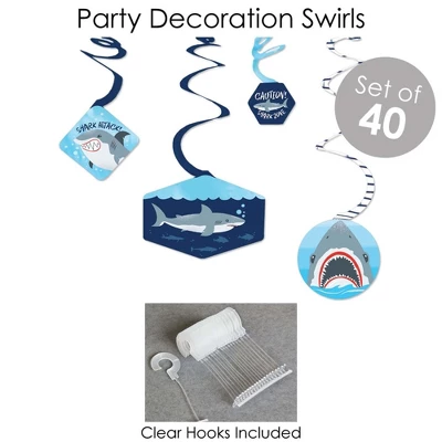 BUNTING BANNER includes: letter and themed pennants. Each pennant measures 8.5″ high x 5.5″ wide. Pennants are numbered in sequence and ribbon is included for easy assembly. PARTY DECORATION SWIRLS includes: 4 different shapes, 10 count per shape, that hang below an accordion-style spiral. Professionally printed double-sided, each decoration swirl in the 40-piece set has a pre-cut hole for easy assembly using the included clear hooks. Party decoration swirls will arrive flat. TABLE TOPPERS includes: 15 Shark Zone centerpiece sticks in three different shapes, each professionally printed double-sided. To use as centerpieces or photo props, wooden dowels and assembly stickers are included. CIRCLE CONFETTI includes: three different sizes of circles – 12 small circles, size 2.75″, 9 medium circles, size 4.25″, and 6 large circles, size 5.5″. Professionally printed double-sided with coordinating shark designs, circle confetti can be scattered around your table. FAVOR KIT: CANDY STICKERS includes: 2 sheets mini candy bar wrappers (total 40), 2 sheets round candy stickers (total 216), 2 sheets circle stickers (total 48). Easy assembly with this peel and stick favor kit. Simply center and press stickers onto your favorite candies to style candy buffets or decorate take-home favors for party guests. Note: Candy is not included.