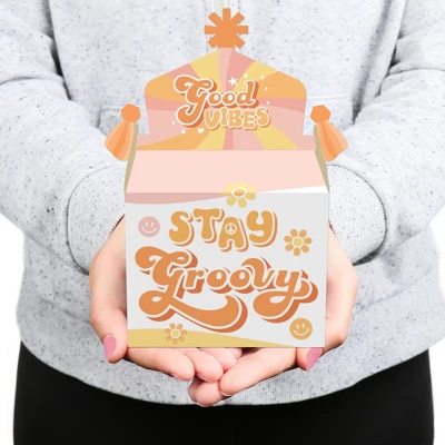 Gable Boxes INCLUDE: 12 Big Dot of Happiness Stay Groovy-themed goodie party favor boxes. Each box SIZE measures 4.25 inches length x 3 inches width x 7.75 inches height. Gable favor boxes are perfect for small gifts and treats that are under 3.5 inches tall (height for storing items in closed box). FUN PARTY FAVORS: Use gable boxes for a unique party gift at any Stay Groovy party. This small, closed favor box can be filled with baked goodies, party trinkets, or thank you gifts. Party guests will have fun with the mystery of what each party loot box will contain. PREMIUM PARTY SUPPLY: Gable treat boxes are professionally printed and double-sided on heavy-duty cardstock paper, with a photo-like shine. They are hand-folded, individually inspected, and then carefully packaged. SIMPLE ASSEMBLY: Pastel gable boxes will arrive flat – Some Assembly Required. Gable boxes have crease lines and numbered tabs for easy folding. Packaging will include assembly instructions. MADE IN THE USA: Stay Groovy Boho Hippie Party goodie gable boxes are designed and manufactured at our Wisconsin facility using materials that are Made in the USA.