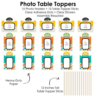 - Includes 15 Photo Holders, 15 Table Topper Sticks, & Clear Assembly Stickers
