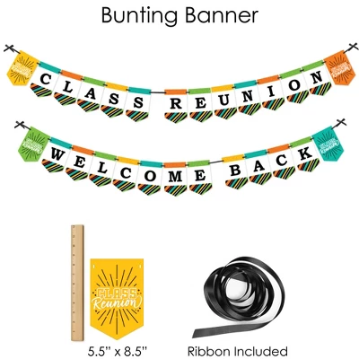 BUNTING BANNER Includes: letter and themed pennants. Each pennant measures 8.5” high x 5.5” wide. Pennants are numbered in sequence and ribbon is included for easy assembly. PARTY DECORATION SWIRLS Includes: 4 different shapes, 10 count per shape, that hang below an accordion-style spiral. Professionally printed double-sided, each decoration swirl in the 40-piece set has a pre-cut hole for easy assembly using the included clear hooks. Party decoration swirls will arrive flat. TABLE TOPPERS Includes: 15 Still Got Class centerpiece sticks in three different shapes, each professionally printed double-sided. To use as centerpieces or photo props, wooden dowels and assembly stickers are included. CIRCLE CONFETTI Includes: three different sizes of circles – 12 small circles, size 2.75”, 9 medium circles, size 4.25”, and 6 large circles, size 5.5”. Professionally printed double-sided with coordinating Brightly Colored designs, circle confetti can be scattered around your table. FAVOR KIT: CANDY STICKERS Includes: 2 sheets mini candy bar wrappers (total 40), 2 sheets round candy stickers (total 216), 2 sheets circle stickers (total 48). Easy assembly with this peel and stick favor kit. Simply center and press stickers onto your favorite candies to style candy buffets or decorate take-home favors for High School Reunion Party guests. Note: Candy is not included.