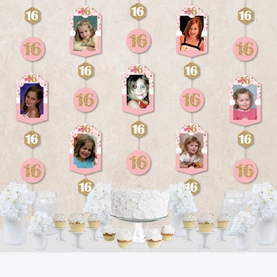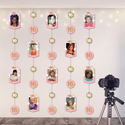 Big Dot of Happiness Sweet 16 Hanging Vertical Photo Garland includes 35 shaped pieces, 1 roll of clear cording, and assembly stickers that you can use to transform your 16th Birthday Party into an unforgettable celebration. With the 10 double-sided photo frames, insert 4 x 6 portrait photos of your guest of honor into the front and back sides. You can display up to 20 pictures using the multiple tabs to secure them into place, allowing your photo garland to look great from all angles. Delightful Decor: Sweet 16 Vertical Garland can be displayed at any length you choose for a dynamic look at your celebration. You can create a backdrop, hang it from the ceiling, or attach it above your dessert table—the possibilities are endless. DIY Assembly: Start by placing your 4 x 6 portrait pictures on the front and back sides of the photo frame cut-out pieces. Then, plan your display by laying the cut-out pieces on a flat surface. Interlock the clear cording into each cut-out piece and secure it with the provided clear stickers. Instructions are also included on the packaging. High-Quality Supply: Sweet 16 vertical hanging garland pieces are professionally printed double-sided on heavy-duty cardstock paper. Photo frames measure 5.5 inches wide x 9.25 inches tall. Circle pieces measure 4.25 inches in diameter. Hexagon cut-outs measure 3 inches wide by 3.25 inches tall. Made In The USA: Sweet 16 Photo Vertical Garlands are designed and manufactured at our Wisconsin facility using materials that are Made in the USA. Sweet 16 Garland Cut-Outs use a No-Mess Glitter Print: Our garland cut-outs are designed with a printed image of glitter, eliminating glitter flake while maximizing bling effect!
