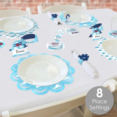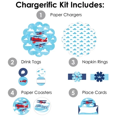 Paper Chargers: Includes 8 scalloped-edge table decorations that are the perfect base for your meal plates. Each place setting charger measures 11.25” in diameter and is a great substitute for a paper doily. They come with a scallop border that can be flared up for an elevated look. Professionally printed double-sided on sturdy cardstock paper, paper chargers are reversible for an alternate look. Napkin Rings: Includes 8 DIY Taking Flight – Airplane paper napkin rings with tassel-shaped ends. Professionally printed double-sided on sturdy cardstock paper, each napkin ring holder is reversible and measures 2.25” wide by 2.25” tall when assembled. To use, carefully curve each ring without creasing and connect by interlocking the tassel-shaped ends together. Vintage Plane Drink Tags: Includes 8 paper drink charms that are perfect for accessorizing your drinkware. Each beverage tag is professionally printed double-sided on sturdy cardstock paper with space on the backside for handwritten personalization. Drink tags measure 1.5” wide by 2.75” and will look great on the stem of a glass or on the rim of your cup. Place Cards: Includes 8 Taking Flight – Airplane name cards that are professionally printed double-sided on sturdy cardstock paper and measure 3.5” wide by 2.5” tall when assembled. To use, push back the top outer edge, revealing the half-circle top. Fold along the pre-scored line in the center to create the tent shape, and then display! Paper Coasters: Includes 8 Vintage Plane themed reversible circles that perfectly highlight your drinkware. Each beverage coaster is professionally printed double-sided on sturdy cardstock paper and measures 4” in diameter.