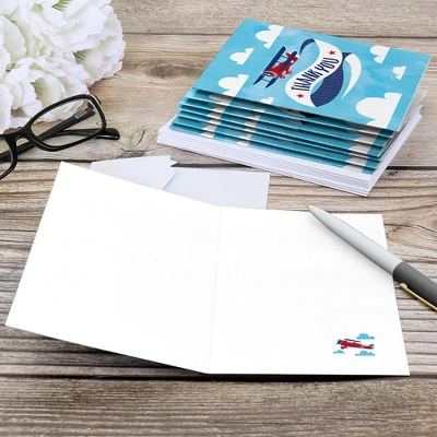 Taking Flight – Airplane Thank You Note Card Set INCLUDES 8 red plane party thank yous and premium white envelopes. Taking Flight – Airplane thank you notes are perfect for any event. The airplane theme is great for a baby shower or birthday party. Taking Flight – Airplane note cards SIZE 5.5 inches by 3.75 inches, folded. The included envelopes measure 5.75 inches by 3.75 inches. The inside of each Taking Flight – Airplane thank you card stationery has a fun graphic as well as space to write a special note to friends and family. PREMIUM THANK YOU CARDS: Taking Flight – Airplane thank you cards are professionally printed on heavy-duty card stock paper with a photo-like shine. They are hand-folded and individually inspected, then carefully packaged with our exclusive squiggle flap envelopes, making this vintage airplane stationary set a must-have for baby shower or birthday parties. MADE IN THE USA: Taking Flight – Airplane – Baby Shower or Birthday Party Thank You Cards are designed and manufactured at our Wisconsin facility using materials that are Made in the USA.