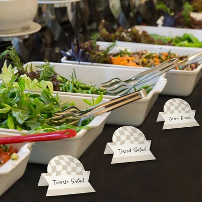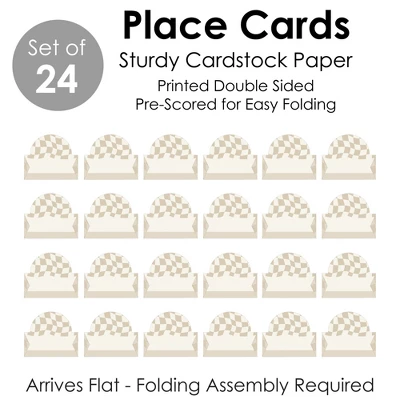 Tan Checkered Party Place Cards INCLUDES 24 individual cards that measure 3.5” wide x 2.5” tall when assembled. Easy to use, these tabletop accents are perfect to use at your next Bridal Shower, Wedding Shower or Birthday Party. VERSATILE IN USE: Whether it’s a small party or large gathering, the Tan and White Place Cards can be used in a variety of ways. Handwrite words in the blank space and then set them on the buffet table, as part of a place setting, or consider using them for an icebreaker activity. EYE-CATCHING DESIGN: Featuring crisp graphics with an innovative cut design, Tan Checkered Party Place Cards will easily draw in attention without taking up too much space. To assemble, push back the top outer edge, revealing the half-circle top. Fold along the pre-scored line in the center to create the tent shape, and then display! HIGH-QUALITY: Checker Place Cards are professionally printed double-sided on sturdy cardstock paper with a photo-like shine. They are individually inspected and carefully packaged by hand. Place Cards will arrive flat with some folding assembly required. MADE IN THE USA: Tan Checkered Party Place Cards are designed and manufactured at our Wisconsin facility using materials that are Made in the USA.