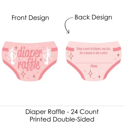 Tutu Cute Ballerina – Diaper Shaped Raffle Ticket Inserts INCLUDES 24 cards with instructions for a diaper raffle game and space for guests to write their name. FUN BABY SHOWER GAME: Baby Shower guests will love playing a diaper raffle – it’s easy to do and helps Mommy-to-Be stock up on diapers before her baby arrives. Diaper raffle tickets are a great addition to any baby shower invitations. Add them to invites for traditional baby shower or a baby sprinkle, give them to Dad’s friends for a diaper party or host an event with coworkers. HOW TO PLAY: Add a Diaper Raffle Ticket to each baby shower invitation, telling guests to bring one package of diapers and the Diaper Raffle Ticket with their name on it. At the shower, have a basket at the gift table and have guests to drop their Diaper Raffle Tickets into it. Have a drawing for the prize winner. You can have one grand prize winner or numerous little ones. Either way, a diaper raffle is a fun way to get everyone in on the games and an easy way to get the parents ready for baby! HIGH-QUALITY PARTY SUPPLIES: Diaper Shaped Raffle Ticket Inserts are professionally printed on heavy-duty cardstock paper with a photo-like shine. They are individually inspected and carefully packaged by hand. This fun baby shower or gender reveal party game will arrive ready to use at your party. Each diaper shaped raffle ticket measures 4″ wide x 2.75″ tall. MADE IN THE USA: Tutu Cute Ballerina – Diaper Shaped Raffle Ticket Inserts – Baby Shower Game is designed and manufactured at our Wisconsin facility using materials that are Made in the USA. We use a No-Mess Glitter Print: Our diaper raffle tickets are designed with a printed image of glitter, eliminating glitter flake while maximizing bling effect!