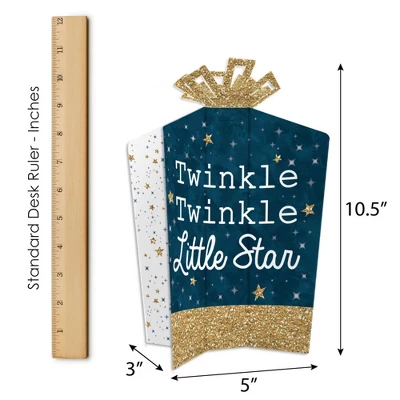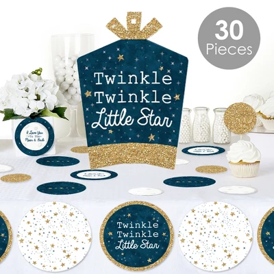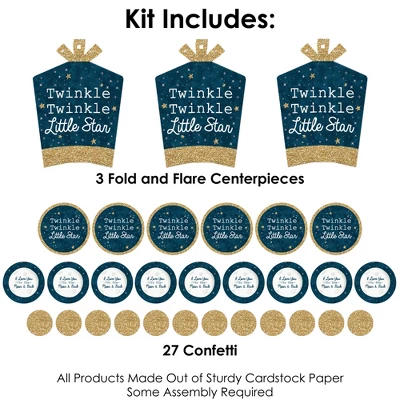Twinkle Twinkle Little Star Terrific Table Centerpiece Kit INCLUDES 27 paper confetti and 3 fold and flare centerpieces that will look amazing at your Birthday Party or Baby Shower. Make a statement at your celebration with this easy DIY table kit! CIRCLE CONFETTI includes 27 cut-out circle shapes in three different sizes – 12 small circles size 2.75 in, 9 medium circles size 4.25 in, and 6 large circles size 5.5 in. Scatter the Starry Night themed confetti across your dessert or buffet table for an impressive addition to your decorations. FOLD AND FLARE CENTERPIECES includes 3 table decorations measure 5 inches wide (front/back) x 3 inches wide (sides) x 10.5 inches tall. These paper table decors require easy folding to flare out each centerpiece for your desired look. Simply, use a flat surface to fold along the scored creases to stand the centerpiece upright and be able to balance on its own. Both Fold and Flare Centerpieces & Confetti Are Professionally Printed Double-Sided on Sturdy Cardstock Paper MADE IN THE USA: Twinkle Twinkle Little Star Terrific Table Centerpiece Kit is designed and manufactured at our Wisconsin facility using materials that are Made in the USA. Terrific Table Centerpiece Kit uses a No-Mess Glitter Print: Our centerpieces and confetti are designed with a printed image of glitter, eliminating glitter flake while maximizing bling effect!