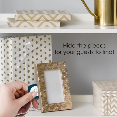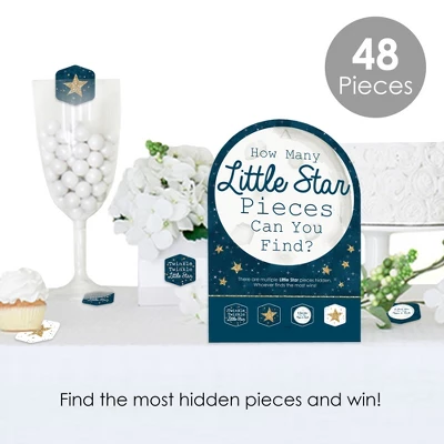 Twinkle Twinkle Little Star Hide and Find Game INCLUDES 1 sign with a built-in stand and 48 hexagon game pieces that you can hide for an exhilarating scavenger hunt at your Baby Shower or Birthday Party. Easy Assembly: Twinkle Twinkle Little Star game sign comes with built-in stand and requires some easy DIY assembly. To display your sign, fold the sides of the stand towards the center. Then, fold down the support piece of the stand until it rests in the notches. How To Play: Hide and find game sign shows the design of each hexagon piece, so display on a table where everyone can see. Then, find creative places to hide the game pieces around your venue. Finally, send your guests to hunt for the pieces. Whoever finds the most pieces wins! For a twist, divide the guests into teams and assign each team a piece to hunt for. High-Quality Supply: Starry Night Themed Hide and Find Game is professionally printed double-sided on heavy-duty cardstock paper with a photo-like shine. Sign measures 7.5” wide by 11” tall and hexagon pieces measure 2.25” wide by 2.25” tall. Made In The USA: Twinkle Twinkle Little Star Hide and Find Game is designed and manufactured at our Wisconsin facility using materials that are Made in the USA. Twinkle Twinkle Little Star Hide and Find Game uses a No-Mess Glitter Print: Our game is designed with a printed image of glitter, eliminating glitter flake while maximizing bling effect!