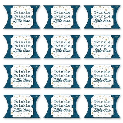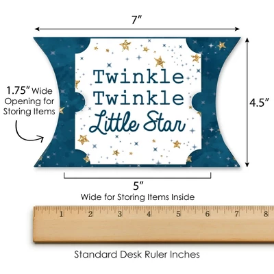 Twinkle Twinkle Little Star Large Pillow Boxes INCLUDES 12 boxes and 12 decorative top pieces. Boxes arrive flat and require some easy assembly. These Star and Moon favor gift boxes make great giveaways at your next Baby Shower or Birthday Party. BOX-ERRIFIC: Twinkle Twinkle Little Star Large Pillow Boxes are SIZE 7 inches long x 4.5 inches wide. Fully assembled boxes have a 1.75-inch-wide opening on both ends and are 5 inches deep for storing items inside. Made of heavy-duty, these loot favor gift boxes can be filled with wrapped treats, trinkets, or small mementos; boxes are suitable for all ages. These boxes are fun and artful, making them perfect accents at any party table setting. EASY ASSEMBLY: Star and Moon Large Pillow Boxes require some assembly before use. Start by securing a top piece to a pillow box by tucking top piece under both tabs on box. Gently squeeze box open and fold ends down in numerical order. NOTE: Top pieces can be displayed horizontally or vertically on boxes. PREMIUM FAVOR BOXES: Twinkle Twinkle Little Star Large Pillow Boxes are professionally printed on heavy-duty paper with a photo-like shine. The ends have full overlapping flaps; no tape or extra materials needed. They are individually inspected and carefully packaged. Treats, trinkets, and small mementos not included. MADE IN THE USA: Twinkle Twinkle Little Star Large Pillow Boxes are designed and manufactured at our Wisconsin facility using materials that are Made in the USA. Large Pillow Boxes use a No-Mess Glitter Print: Our Pillow Boxes are designed with a printed image of glitter, eliminating glitter flake while maximizing bling effect!