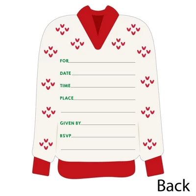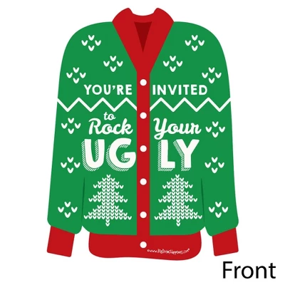 Ugly Sweater Fill-In the Blank Invitation Set INCLUDES 12 Christmas or holiday party invitations and 12 premium white envelopes. Ugly Sweater fill-in invitations are perfect for any event. The green and red theme is great for a Christmas or holiday party. Ugly Sweater party invitations SIZE 5 inches by 6.75 inches. The included envelopes measure 5 inches by 7 inches. The back of each Ugly Sweater Christmas or holiday party invitation has space to add your party details: For: Date: Time: Place: Given By: RSVP: PREMIUM PARTY INVITATIONS: Ugly Sweater party invitations are professionally printed on heavy-duty card stock paper with a photo-like shine. They are individually inspected, then carefully packaged with our exclusive squiggle flap envelopes, making this Ugly Sweater stationary set a must-have for any Christmas or holiday party. MADE IN THE USA: Ugly Sweater – Shaped Invitations are designed and manufactured at our Wisconsin facility using materials that are Made in the USA.