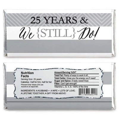 We Still Do Standard Candy Bar Wrapper Kit INCLUDES 24 chocolate bar wrappers and 24 foils, perfect for styling an adorable silver and white candy buffet or unique We Still Do 25th wedding anniversary party favors. We Still Do candy bar wrappers MEASURE 5.25 inches wide x 6.25 inches high and will quickly add the We Still Do party theme to all your sweet treats. It is easy to wrap Hershey’s® standard sized candy bars with these silver and white “Å“25 Years & We Still Do” paper wrappers and foils! EASY PARTY DECORATIONS: Decorated We Still Do candy bars are an easy anniversary party favor to gift all your guests. Set a decorated candy bar at each placesetting, package in small gift bags as a party favor or display in a pretty bowl at your candy buffet. Get creative with your silver and white DIY 25th wedding anniversary party decoration ideas! PREMIUM PARTY SUPPLIES: We Still Do chocolate candy bar wrappers are professionally printed on heavy-duty paper with a photo-like shine. They are individually inspected and carefully packaged by hand with silver foil wraps. Follow the included instructions to quickly wrap a foil around each chocolate candy bar and then add the printed paper wrapper, securing with tape. We Still Do – 25th Wedding Anniversary – Candy Bar Wrapper Party Favors are designed and manufactured at our Wisconsin facility using materials that are Made in the USA. Chocolate Bar Wrappers use a No-Mess Glitter Print: Our party favors are designed with a printed image of glitter, eliminating glitter flake while maximizing bling effect! Please Note: Candy bars are not included but are available at your local grocery store. Candy bar wrappers will fit standard 1.55 oz chocolate bars.
