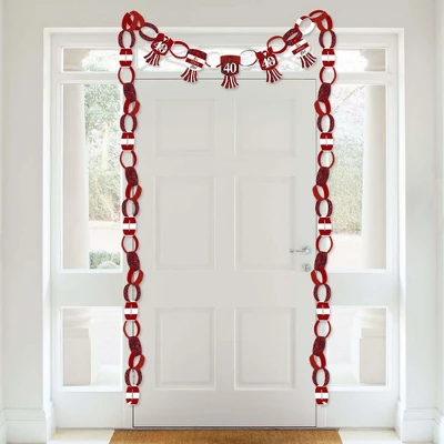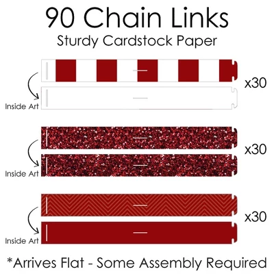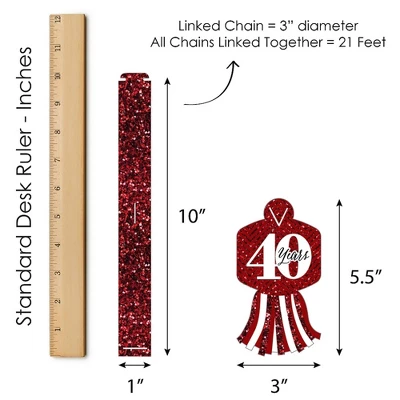 Paper Chains Garland INCLUDES: 90 paper chain links in 3 coordinating patterns and 30 paper tassels in 3 coordinating patterns. Completed paper chains garland measures approximately 21 feet, with some assembly required. One chain link SIZE 10 inches x 1 inch and one paper tassel SIZE 3 inches x 5.5 inches. SIMPLE ASSEMBLY: Anniversary paper chain decoration kit will arrive flat and is easy enough for the whole family to assemble. First, form a chain link into a circle and insert the tab through the slit. Slide the next chain link through the first link and repeat until all chain links are connected, forming a paper chains garland. Attach paper tassels by inserting paper tassel through center slit located on the chain link. DIY PARTY SUPPLIES: Dress up all areas of your ruby and black 40th anniversary party with paper chains. Some fun decorating ideas are to wrap paper chains down a staircase railing, hang above doorways, or use as a photo booth backdrop. For an effortless look, stretch paper chains garland down the center of your dining room table. Paper chains can also be used to count down the days to a big event or trip. PREMIUM PARTY DECORATION: Paper chain decorations are professionally printed and double-sided on sturdy cardstock paper, with a photo-like shine. They are then individually cut, inspected, and carefully packaged. We Still Do – 40th Wedding Anniversary paper chains garland is a DIY kit that can be used in many ways. Get inspired with this fun do-it-yourself anniversary party decor kit! MADE IN THE USA: We Still Do – 40th Wedding Anniversary Party paper chains garland is designed and manufactured at our Wisconsin facility using materials that are Made in the USA. We Still Do – 40th Wedding Anniversary paper chains garland use a No-Mess Glitter Print: Our DIY party decorations are designed with a printed image of glitter, eliminating glitter flake while maximizing bling effect!